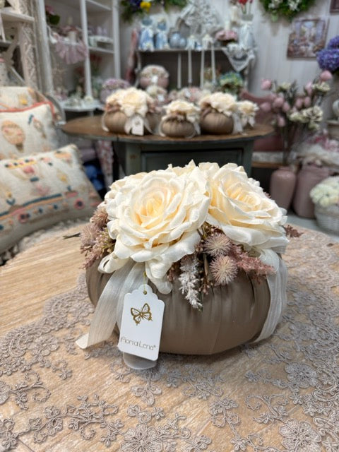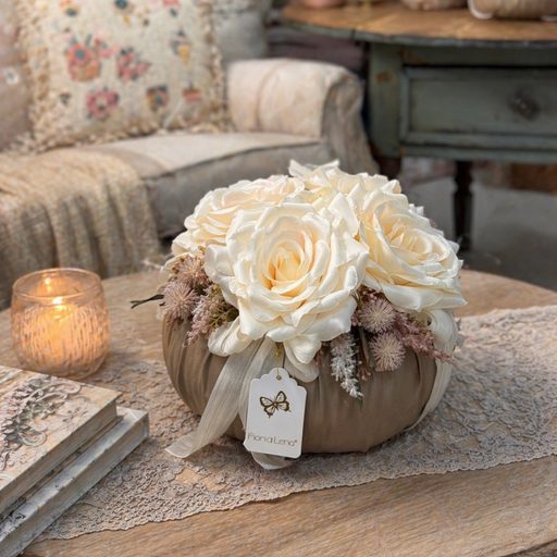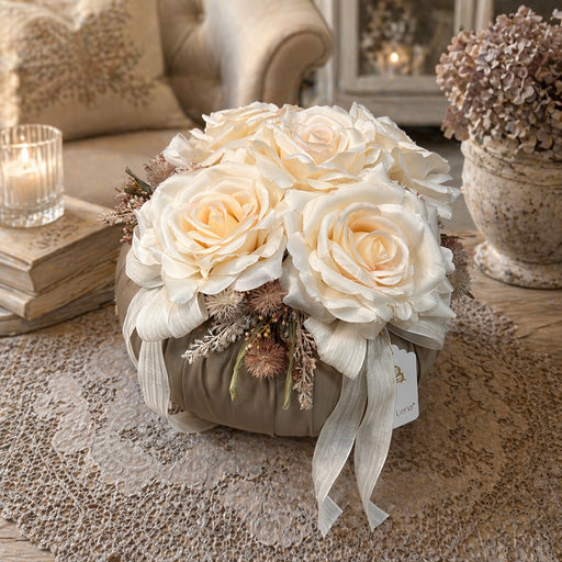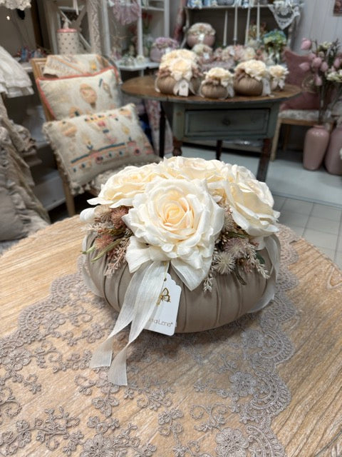 Visualizza tutti i dettagliUna raffinata composizione floreale shabby chic firmata Fiori di Lena: quattro grandi rose avorio in seta, disposte su un morbido pouf in tessuto f...
