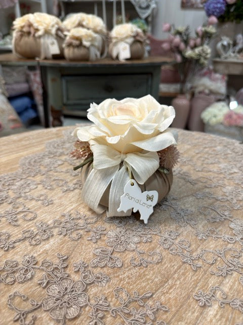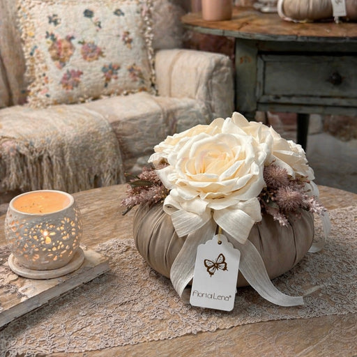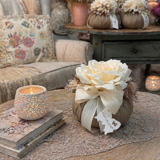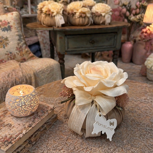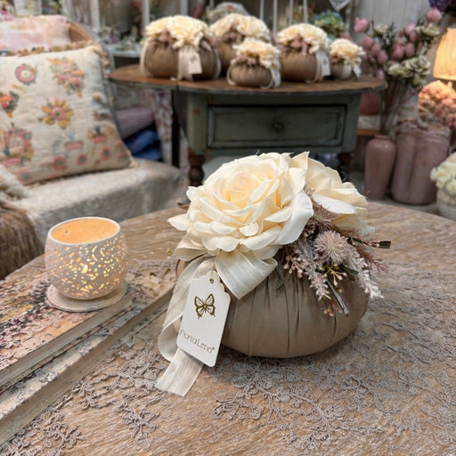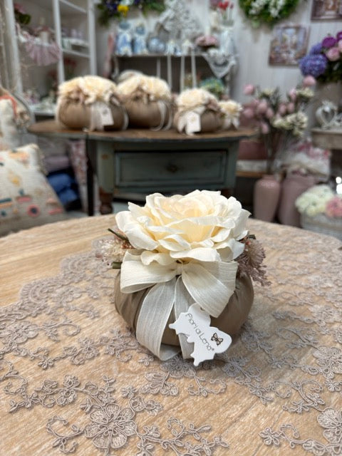 Una composizione floreale shabby chic dal fascino delicato firmata Fiori di Lena: una rosa avorio in seta, protagonista su un morbido pouf piccolo ...
