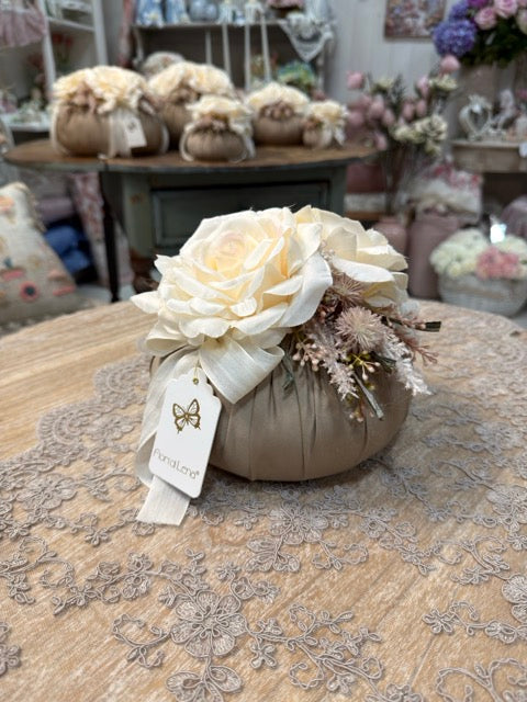Visualizza tutti i dettagliUna delicata composizione floreale shabby chic firmata Fiori di Lena: due grandi rose avorio in seta, disposte su un morbido pouf in tessuto fango ...