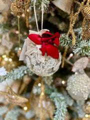 Addobba il tuo albero con la sfera in velluto di COCCOLE DI CASA. Grazie alle sue perline e al fiocco in pizzo questa sfera aggiungerà un tocco di eleganza e comfort alla tua casa.