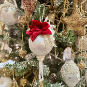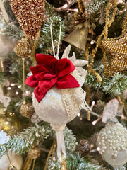 Addobba il tuo albero con la sfera in velluto di COCCOLE DI CASA. Non solo i due fiori, uno rosso e uno panna, e non solo le perline applicate sulla sfera ma anche il merletto e il fiocco in pizzo aggiungono un tocco di eleganza e comfort alla tua casa.