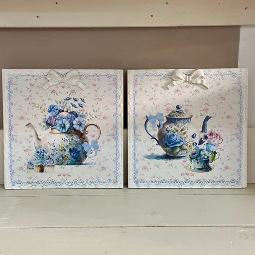 Visualizza tutti i dettagliCESARIA ARTE Set da 2 Quadri in Legno da Cucina con Fiocco Teiere e Fiori Azzurri