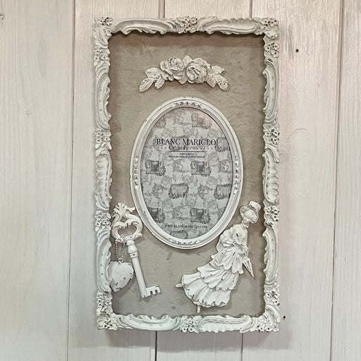 Blanc MariclòEsalta i tuoi ricordi più preziosi con quadro il portafoto BLANC MARICLÒ in resina avorio, decorato con rose, un’elegante dama, una chiave e un cuo...