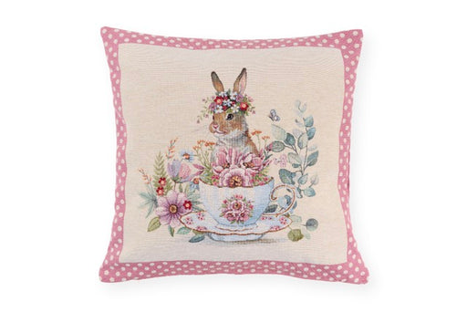 Incantevole federa cuscino jacquard firmato NUVOLE DI STOFFA con adorabile coniglietto seduto in una tazza da tè vintage, circondato da delicati fi...