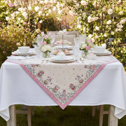 Porta la magia della primavera in tavola con il Centrotavola Quadrato "Jacquard" di NUVOLE DI STOFFA. Il delicato tessuto jacquard è impreziosito da un incantevole motivo pasquale con coniglietti, tazze da tè vintage e fiori primaverili, incorniciato da un grazioso bordo a pois rosa.