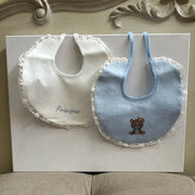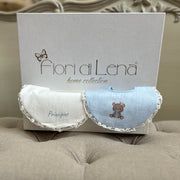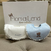 Scatola con bavette di FIORI DI LENA. Realizzate in morbido lino con eleganti dettagli in pizzo, queste bavette non solo proteggono i vestiti del tuo piccolo ma aggiungono anche un tocco di classe al suo look. Prodotto artigianale. Made in Italy.