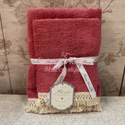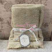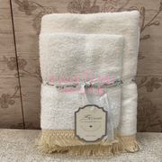 Vi presentiamo la coppia di asciugamani di BLANC MARICLÒ! Realizzati in morbida spugna di cotone con elegante balza con nappette.