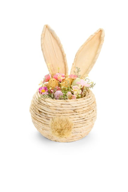 Nuvole di StoffaAdorabile cestino decorativo a forma di coniglio in vimini naturale con orecchie e composizione floreale. Perfetto per decorazioni pasquali e prima...
