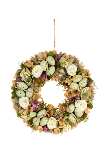 Nuvole di StoffaSplendida ghirlanda decorativa pasquale con uova verdi e beige, fiori secchi e dettagli naturali. Perfetta per decorare porte, pareti o come centro...