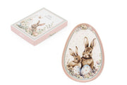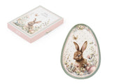 Raffinato piatto decorativo a forma di uovo in porcellana con tenero coniglietto, un prezioso accessorio pasquale che unisce bellezza e funzionalità. Ogni piatto raffigura adorabili coniglietti circondati da delicati fiori primaverili e farfalle, con un raffinato bordino dorato o argentato che impreziosisce il contorno.