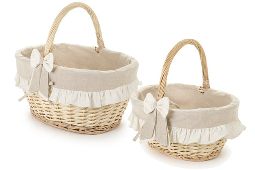 Nuvole di StoffaIncantevole set di 2 cestini portaoggetti in vimini naturale con manico intrecciato, fodera interna con balza arricciata e romantico fiocco decorat...