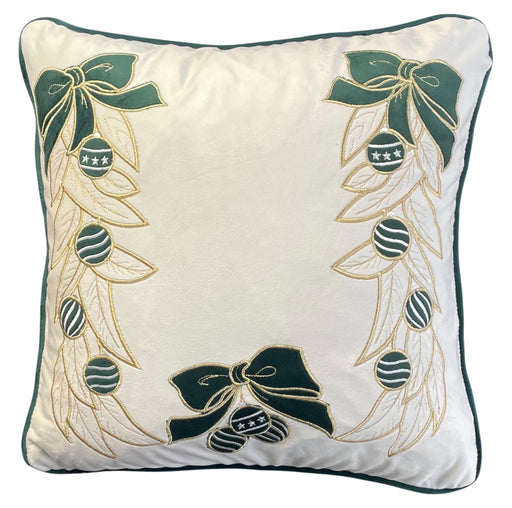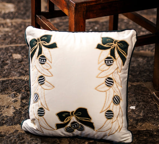 CLODETTE Cuscino Natalizio in Velluto con Ricami di Fiocchi e Foglie " JOLIE " Panna