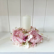 Elegante Portacandela centrotavola decorativo , impreziosito da delicate peonie, rose e ortensie in tonalità rosa e lilla.