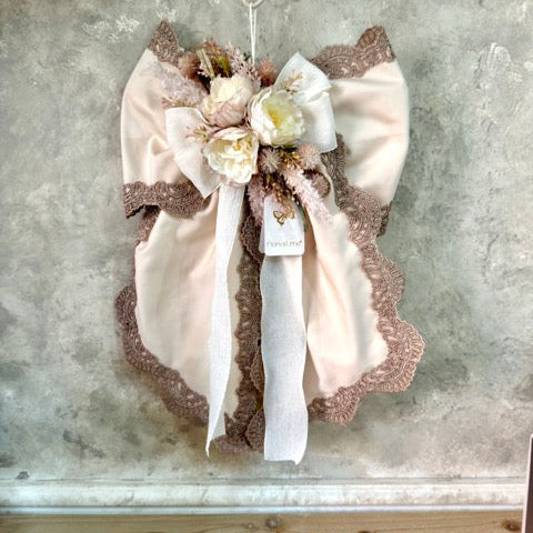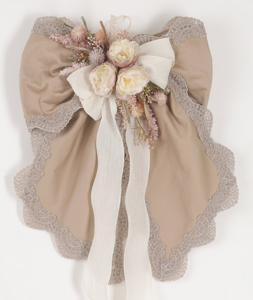 Fiori di LenaSontuoso fiocco decorativo in seta beige tortora con bordo in pizzo trina ricamato, impreziosito da una raffinata composizione floreale con nastri....
