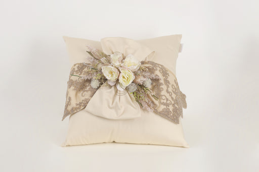 Fiori di LenaRaffinato cuscino quadrato in morbido tessuto avorio, impreziosito da un elegante fiocco in pizzo ricamato, rosa e una delicata composizione florea...