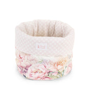 Delizioso cestino porta pane in cotone della collezione "FIORIRÀ" di NUVOLE DI STOFFA, caratterizzato da una romantica stampa floreale con peonie acquerellate. Questo elegante cestino presenta una forma rotonda perfetto per servire pane, grissini, focacce o dolci. La parte esterna è decorata con una splendida stampa floreale che raffigura peonie rosa, lilla e pesca in piena fioritura su fondo bianco. L'interno è rivestito in tessuto coordinato che garantisce morbidezza e protezione.