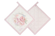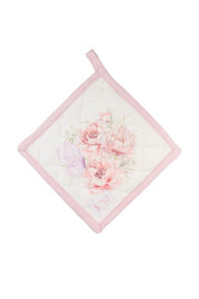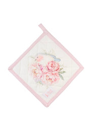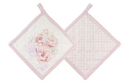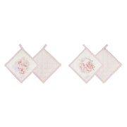 Set di eleganti presine in cotone della collezione NUVOLE DI STOFFA, decorate con delicati motivi floreali e graziosi uccellini o farfalle. Il design "FIORIRÀ" presenta tonalità rosa cipria e bianco panna, con asola per appendere. Accessori indispensabili per la cucina che uniscono funzionalità e stile shabby chic raffinato. Perfette per proteggere le mani con eleganza.