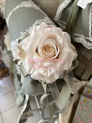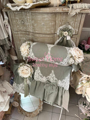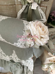 Rilassati con il cuscino a caramella in lino verde salvia con pizzo e rose profumate laterali FIORI DI LENA. Il lino naturale e il pizzo inconfondibile aggiungeranno un tocco di eleganza e comfort alla tua casa.