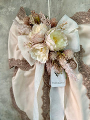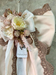 Sontuoso fiocco decorativo in seta beige tortora con bordo in pizzo trina ricamato, impreziosito da una raffinata composizione floreale con nastri. Un elemento d'arredo versatile che porta eleganza shabby chic ovunque venga posizionato.