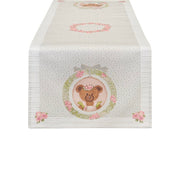 Disponibile in due varianti: runner con orsetti vestiti in rosa e verde che giocano con giocattoli e dettagli floreali, oppure runner con orsetto centrale in cornice rotonda decorativa con fiori e dettagli romantici. Entrambi i modelli presentano tonalità pastello delicate e un design shabby chic raffinato. Realizzato in cotone di qualità, questo runner è ideale per proteggere e decorare tavoli. Lavabile in lavatrice, pratico e resistente.
