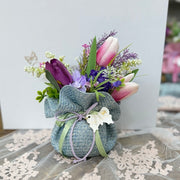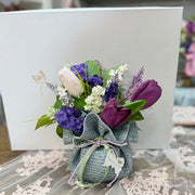 Ogni vasetto è decorato con tulipani, lavanda, anemoni e piccoli fiori selvatici nei toni del lilla, viola e rosa antico — legato con un nastro verde salvia e un fiocco in organza, per un effetto romantico e provenzale di grande impatto visivo.